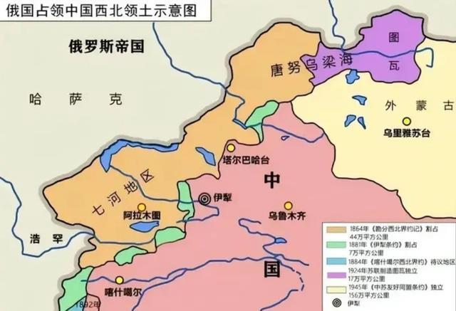 100多年后,也就是1862年到1864年这段时间,沙俄开始入侵新疆,抢走了44万平方公里的土地。